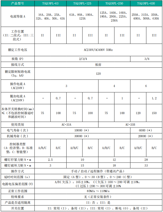 TGQ1NPL 系列自動轉(zhuǎn)換開關(guān)適用于交流 50Hz,額定工作電壓 AC230V/AC400V, 額定電流至630A 的單相二線 / 三相四線雙路供電電網(wǎng)中,用于從一路電源斷開負(fù)載電路并連接至另一路電源上。具有自行動作和可選的人工操作特性的轉(zhuǎn)換開關(guān)電器。當(dāng)常用電源被檢測到出現(xiàn)異常時,ATSE 自動將負(fù)載從常用電源轉(zhuǎn)換至備用電源如果常用電源恢復(fù)正常時,在自投自復(fù)模式下,則自動將負(fù)載返回至常用電源。