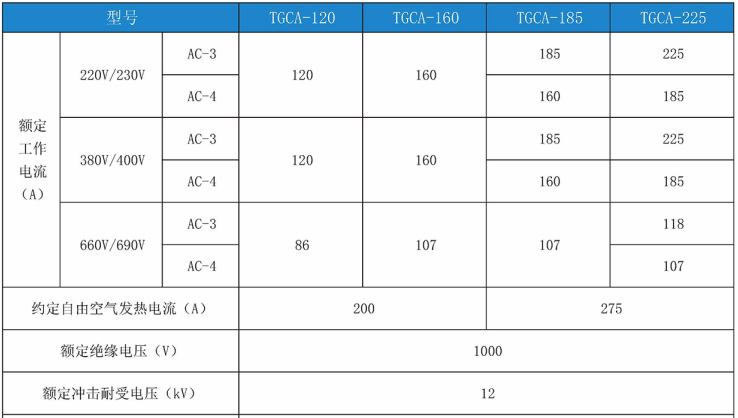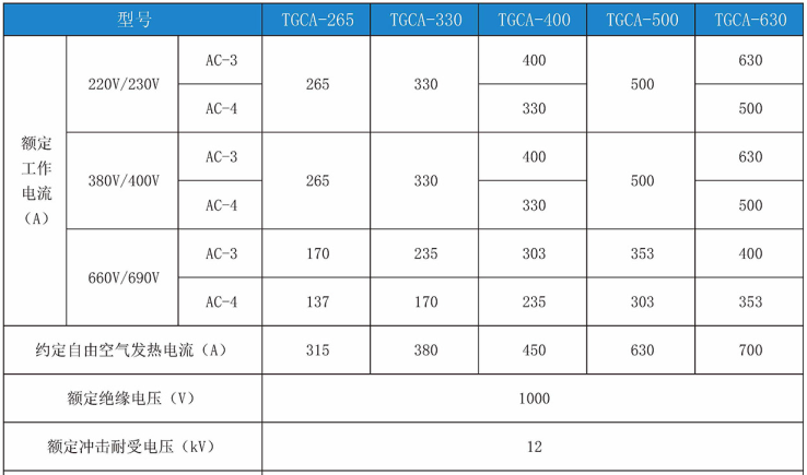 TGCA系列交流接觸器(以下簡稱接觸器),主要用于交流50Hz或(50/60Hz),額定工作電壓至690V,在AC-3使用類別下額定工作電壓380V時,額定工作電流至630A的電力系統中供遠距離接通和分斷電路之用。并可與適當的熱過載繼電器組成電磁起動器,以保護可能發生過負荷的電路。接觸器適宜于頻繁的起動和控制交流電動機。