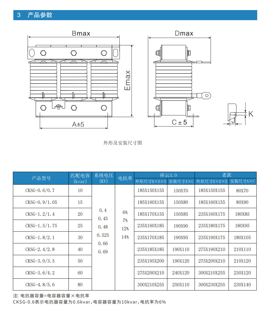 CKSG、CKDG系列串聯電抗器與低壓并聯電容器組相串聯,用以抑制電網電壓波形畸變及在電容器組投入電網時限制合閘浪涌電流,也可用于其它需要限制沖擊電流和濾波的場所。