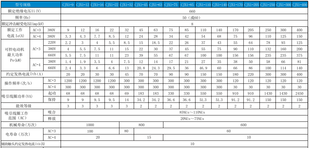 CJX1系列交流接觸器(以下簡稱接觸器)主要用于交流50Hz(或60Hz),額定絕緣電壓為660V,在AC-3使用類別下額定工作電壓為380V時額定工作電流為09~400A的電力線路中。作為供遠距離接通和分斷電路之用,并適用于控制交流電動機的起動、停止及反轉。符合標準:GB/T 14048.4、IEC 60947-4-1及GB 21518